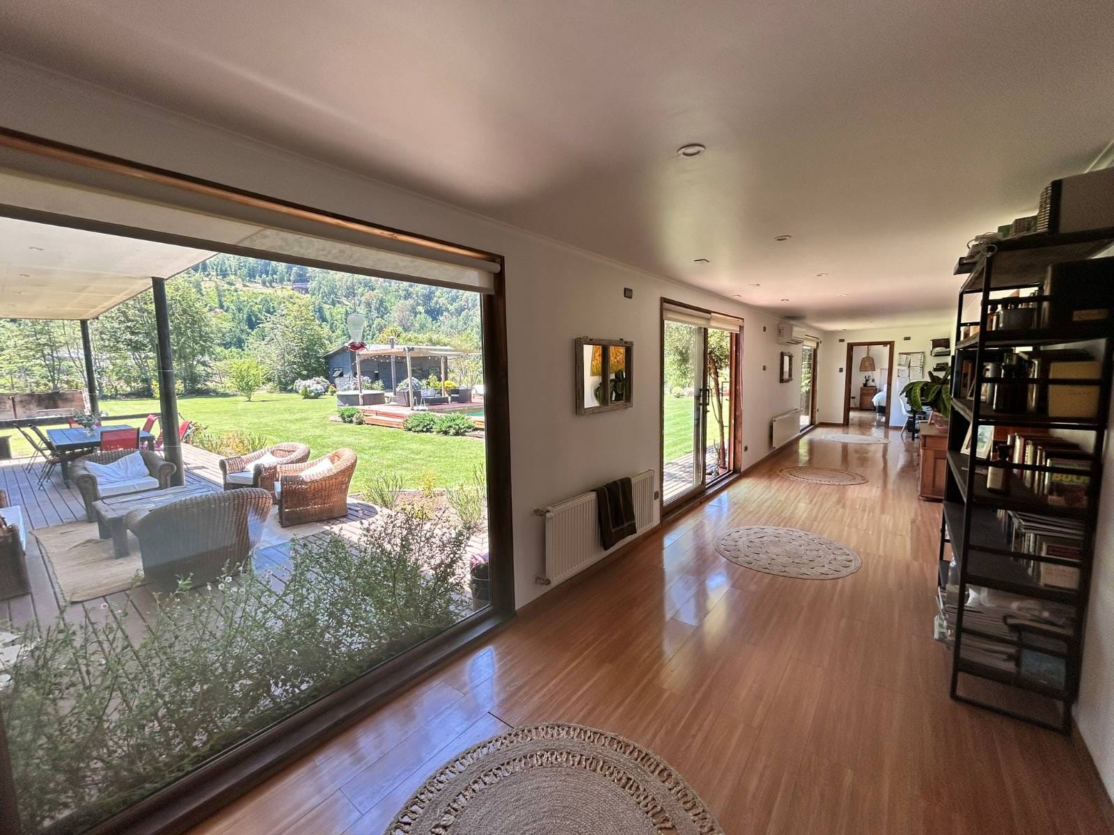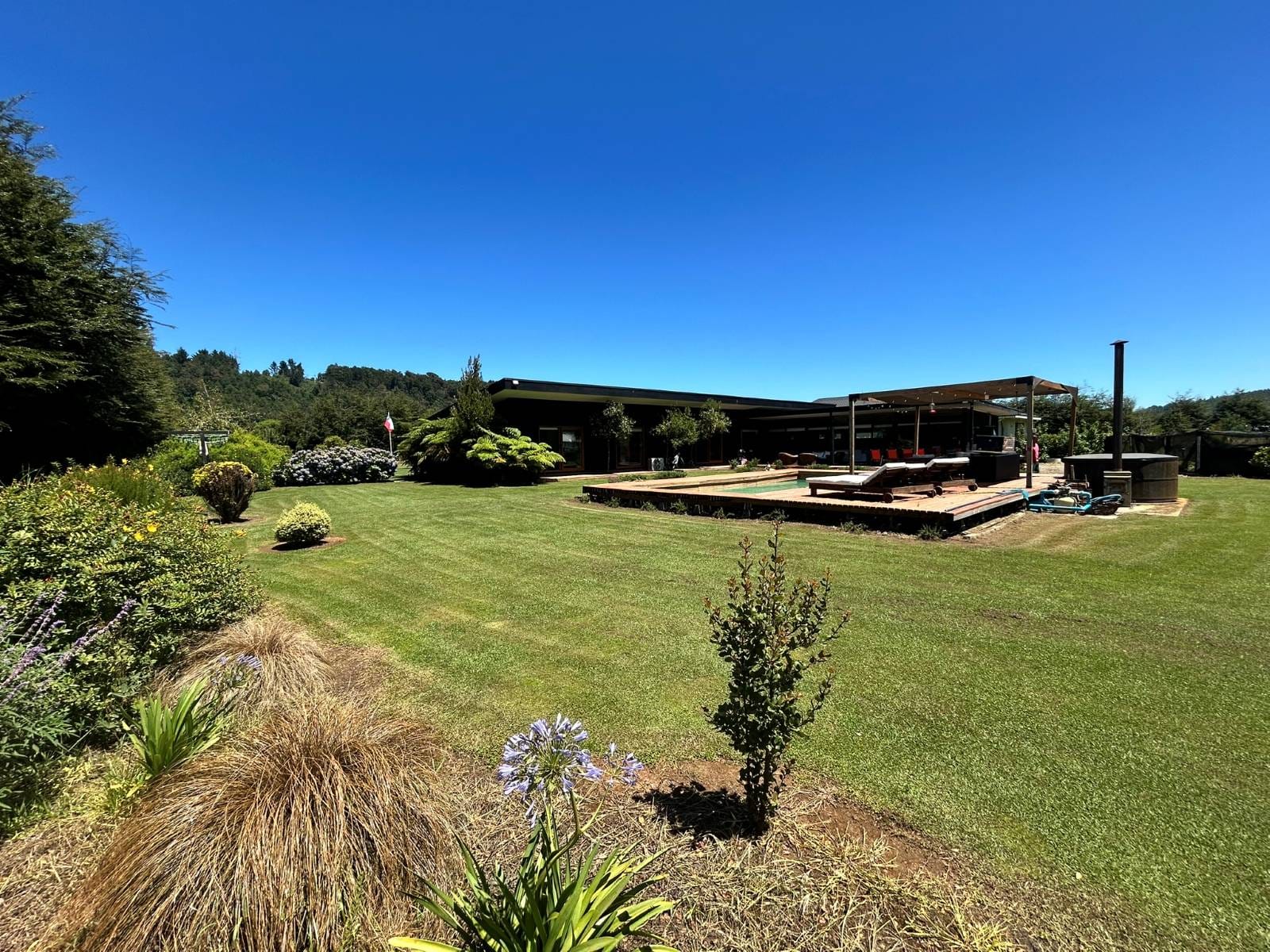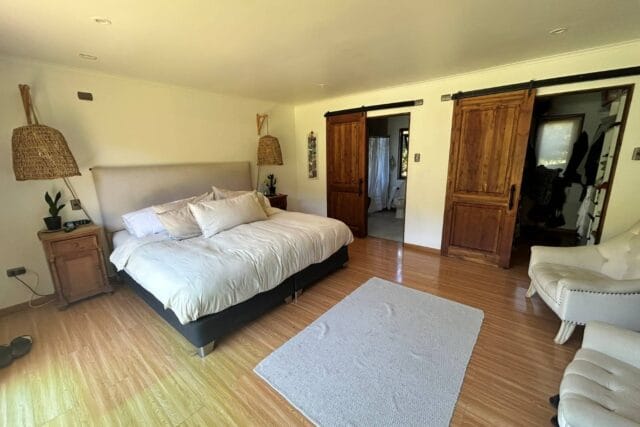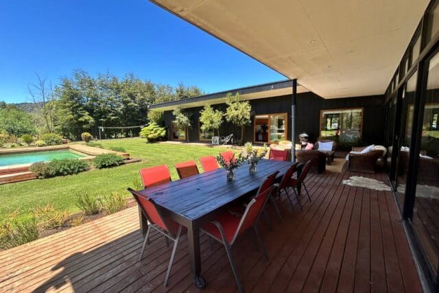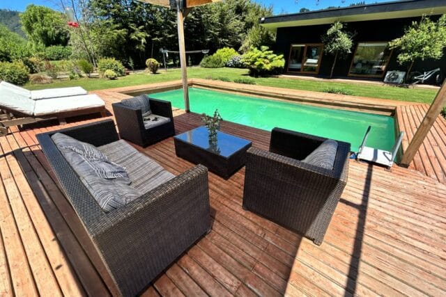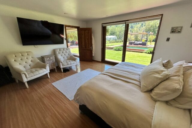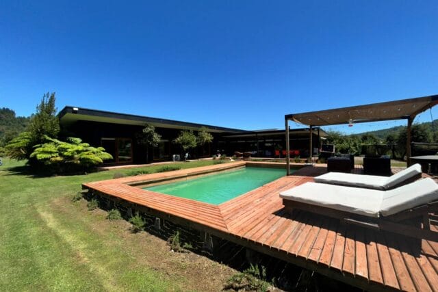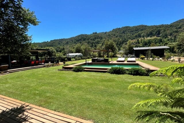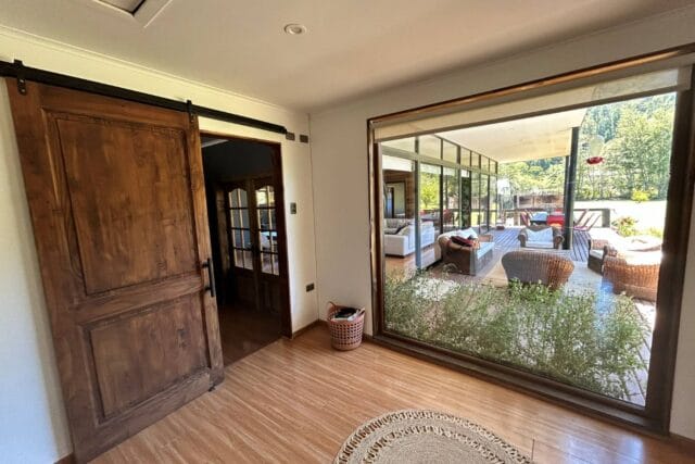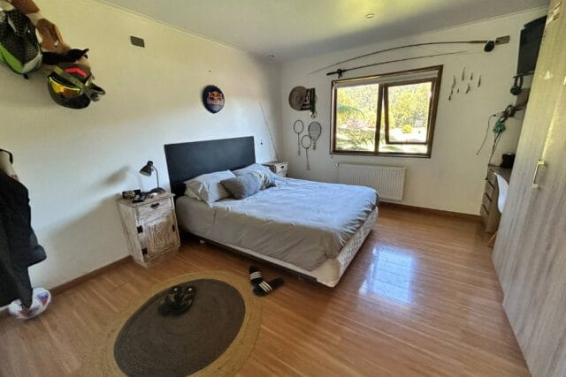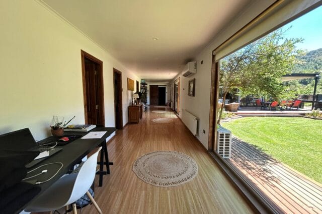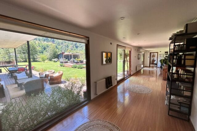En Quitacalzón a 5 minutos de Valdivia, en sector de alta plusvalía y belleza natural, sitio de 5.000 metros cuadrados, casa de 270 metros cuadrados, 4 dormitorios (principal en suite), 4 baños, living, comedor, sala de estar, cocina americana, despensa, calefacción central, aire acondicionado, terraza, piscina, tinaja de agua caliente, amplio patio con cancha de futbol, quincho independiente de 72 metros cuadrados, con comedor, barra, baño y amplio dormitorio. Taller de 60 metros cuadrados.